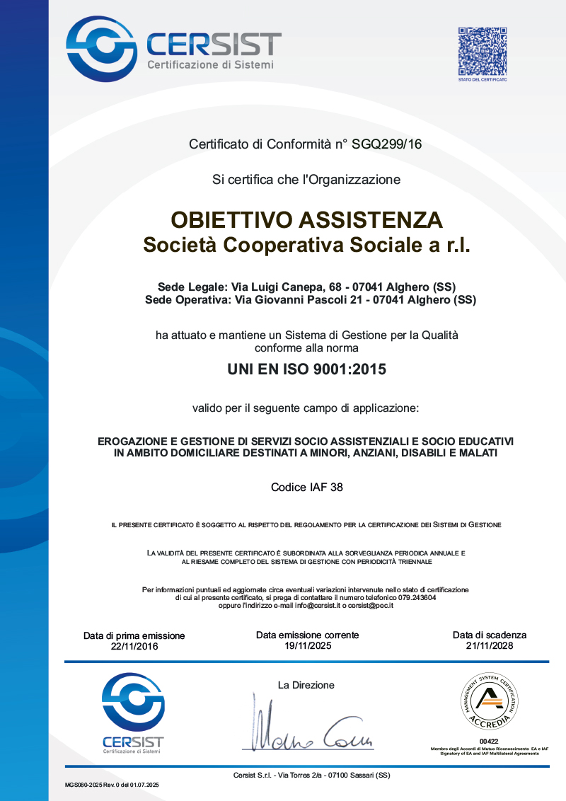 Certificazione di qualità UNI EN ISO 9001 n° SGQ299/16
